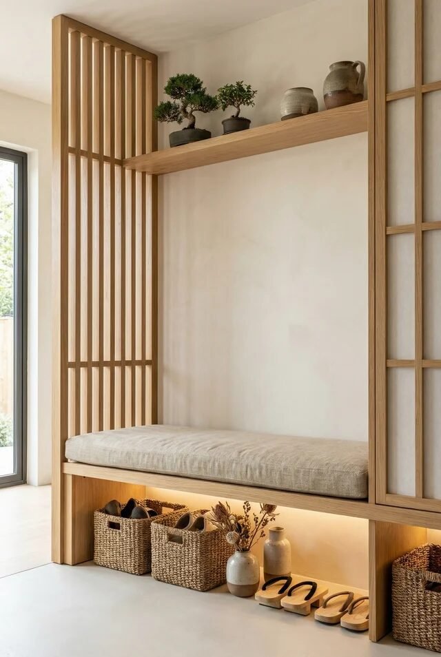 Styling stays minimal but grounded—woven baskets, neutral cushions, and a few earthy decor pieces. If you’re recreating this look, focus on proportions. Keep the bench height comfortable, align the shelf above with the slats, and don’t overcrowd. When everything is aligned and scaled correctly, the space feels calm almost automatically—and that’s the whole Japandi goal.