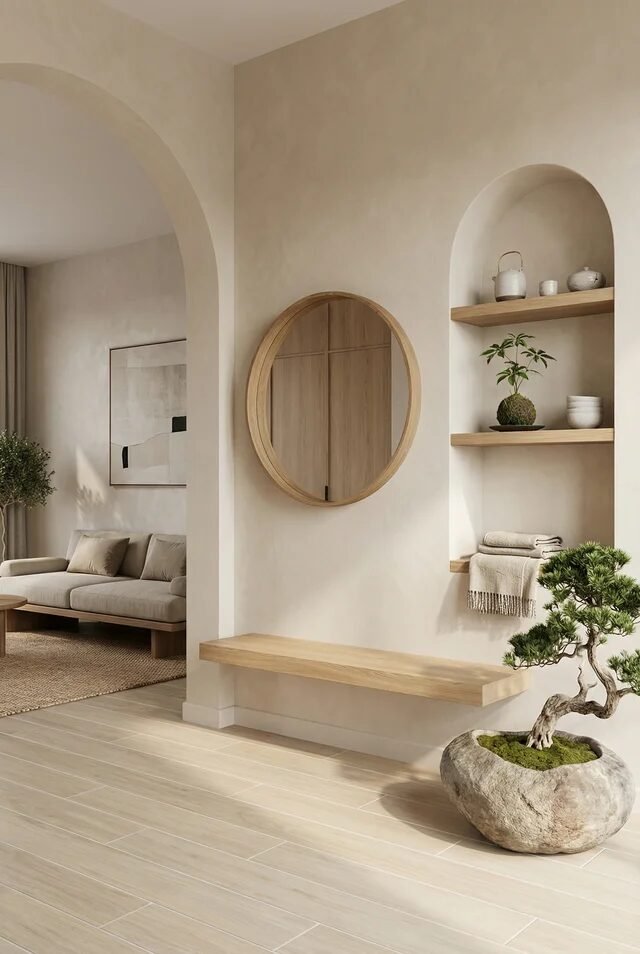 This entryway is basically whispering “relax, we’ve got our life together.” The soft arches instantly create a sense of flow, guiding your eye from one zone to another without harsh breaks. Arches are key in Japandi because they soften structure and make transitions feel natural, not forced. Paired with the round mirror, we get that curve-on-curve harmony that feels super intentional.