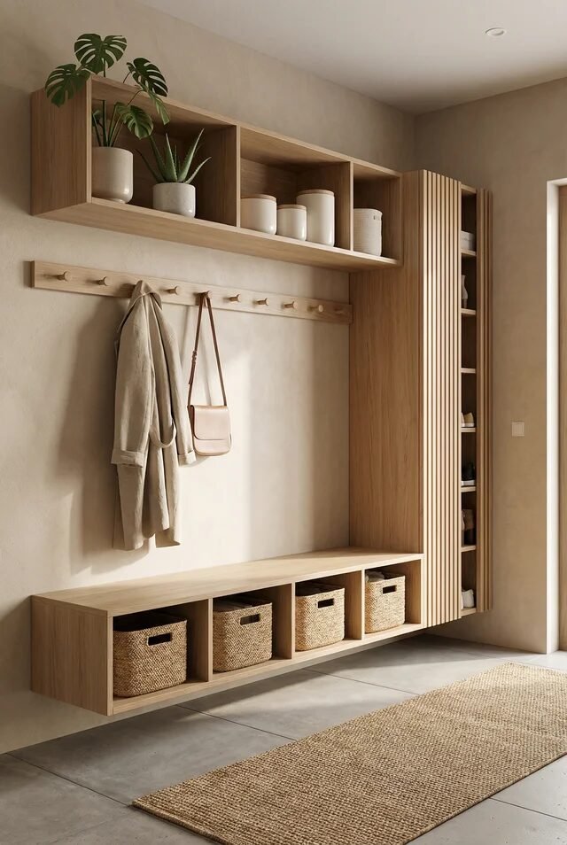 The neutral palette is doing its quiet luxury thing—soft beige walls, light wood, and muted textiles. But the real trick is layering heights. You’ve got low seating, mid-level hooks, and higher shelves. Varying vertical placement keeps the wall from feeling flat or one-dimensional.