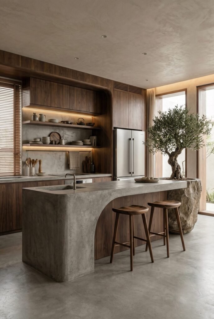 Sculptural Concrete Island Meets Warm Wood Minimalism