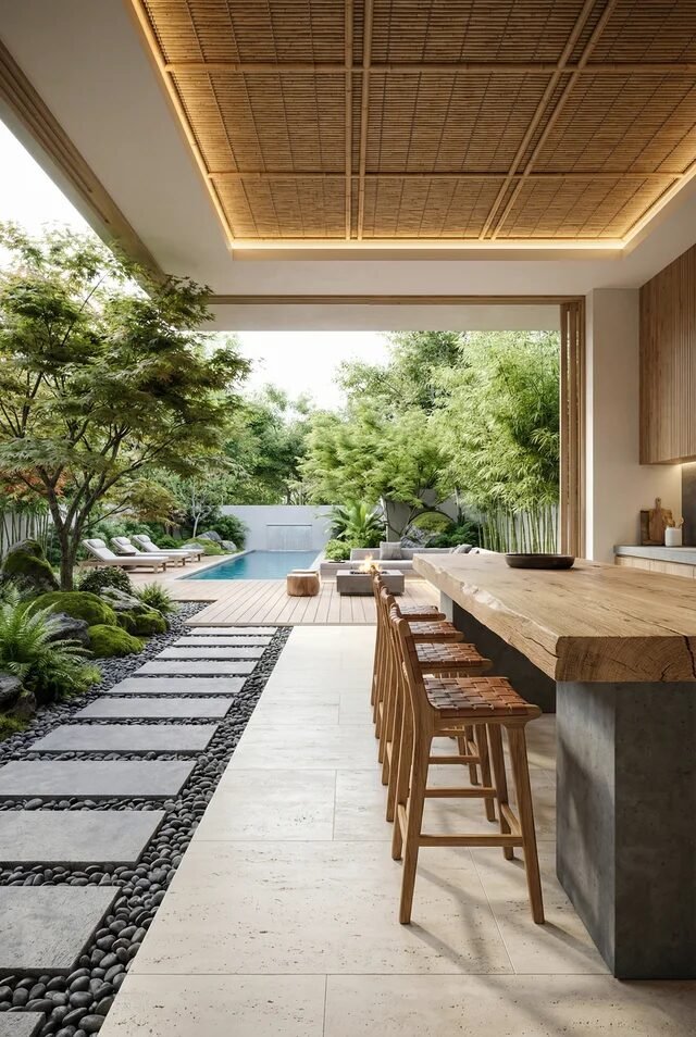Material-wise, this is Japandi gold. Warm wood, raw stone, and soft greenery create a balanced contrast between structured surfaces and organic elements. If we’re recreating this, don’t overthink the palette. Stick to 3–4 tones max and let texture do the talking. The woven ceiling detail? That’s your “quiet luxury” moment.
