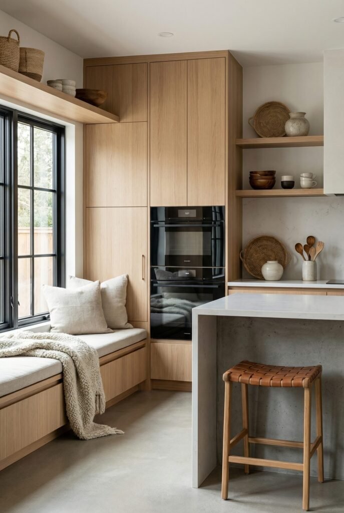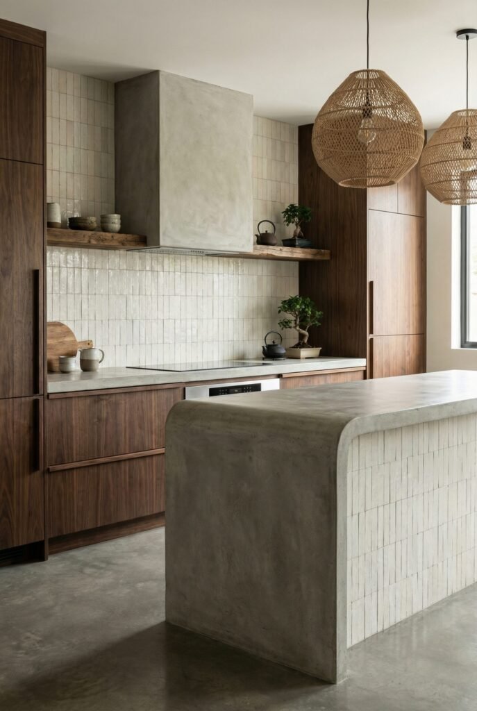 Okay, this island is not just an island—it’s a main character. The curved concrete base softens what could’ve been a cold, industrial vibe, making it feel intentional, sculptural, and very Pinterest-core without trying too hard. Pairing it with flat-panel wood cabinetry keeps everything grounded and warm, which is key in Japandi design.