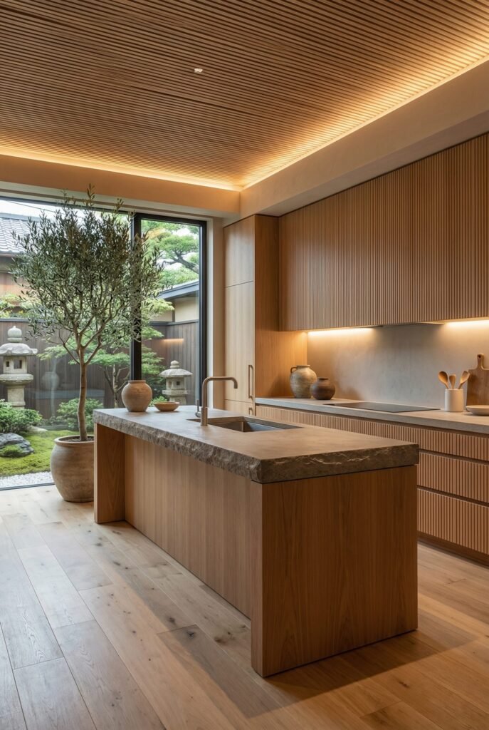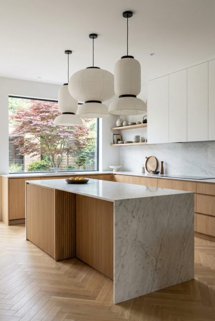 What’s working here is contrast done gently. Light wood cabinetry, white upper units, and marble surfaces blend seamlessly, while the ribbed island adds just enough texture. Subtle contrast is the Japandi sweet spot—nothing too stark, nothing too flat.