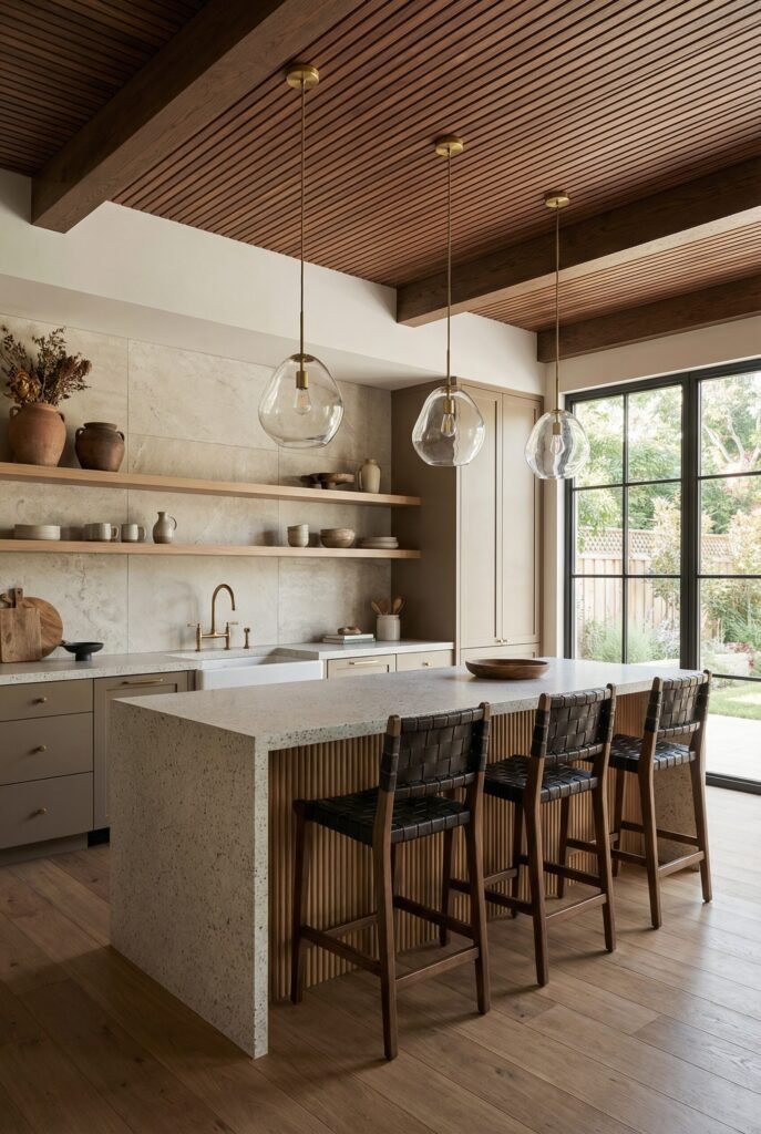 The palette stays grounded in warm neutrals, but the real magic is in repetition. You’ve got slats on the ceiling, subtle linear textures on the island, and horizontal shelving to balance it out. Repeating patterns like this creates rhythm, which keeps minimalist spaces from feeling flat or lifeless.