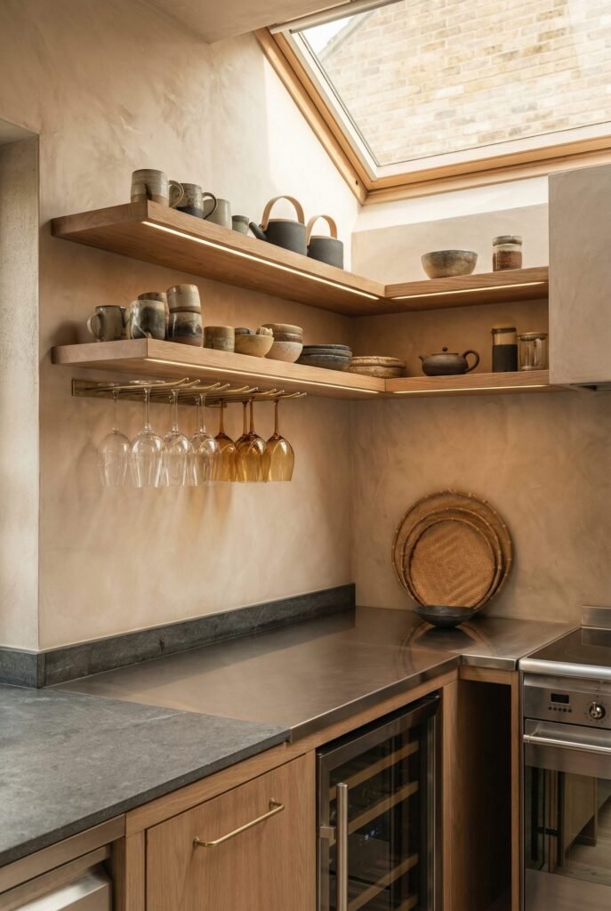 If we’re recreating this, limit your color palette and stick to earthy tones. Install warm under-shelf lighting to highlight textures and create depth. And please, no random clutter—every item should feel like it earned its spot. Yes, even your favorite mug.