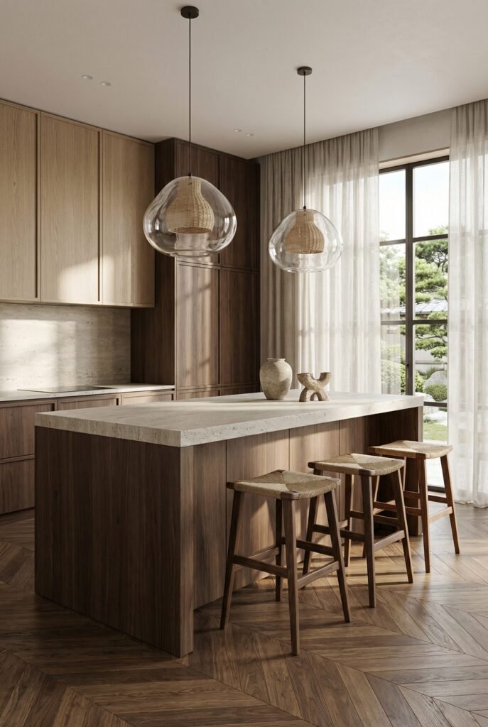 What makes these kitchens work isn’t just the materials—it’s how they interact. Warm wood softens stone, lighting creates depth, and organic elements bring life into structured spaces. That push-and-pull between natural and minimal is what keeps everything from feeling flat or sterile. It’s subtle, but it matters.