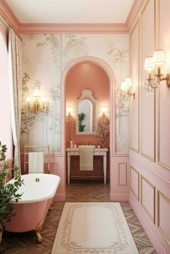 The secret here is tone-on-tone pinks — walls, tub, and moldings all sit within the same warm blush family, which makes the room feel cohesive instead of chaotic. Then, the gold accents act like jewelry: elegant, shiny, and never too much. If you’re recreating this at home, aim for two finishes max (like brushed brass + matte white) to maintain that lux-but-soft vibe.