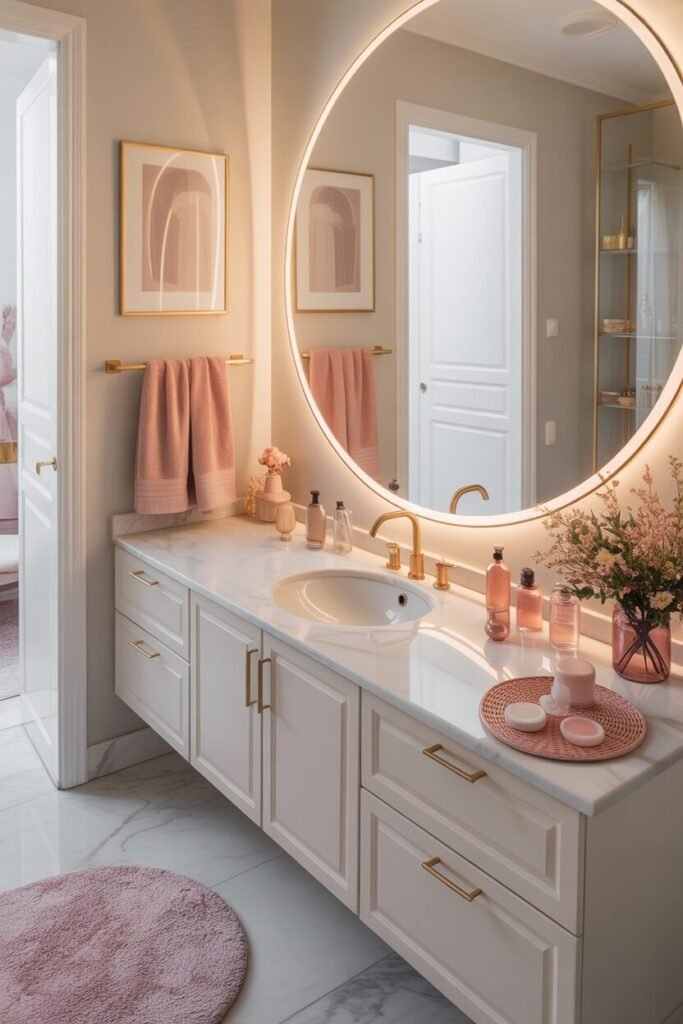 The palette is a clever mix of neutrals and dusty pinks. By keeping cabinets white and simple, the decor has room to shine — literally — with brass hardware and curated pink accessories. The trick here is layered lighting: overhead, mirror glow, and reflective surfaces all play together to prevent the room from feeling flat.