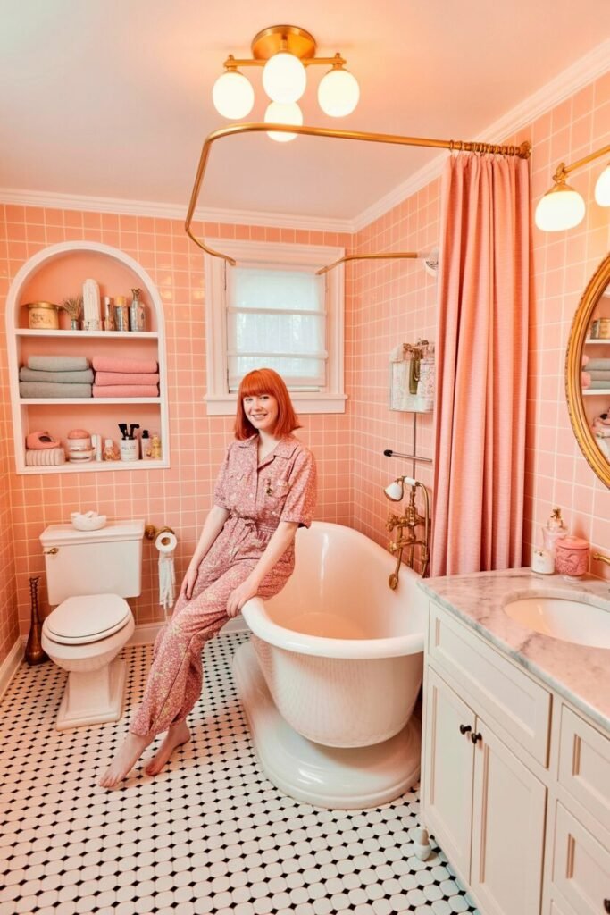If you’re recreating this look, start with one dominant pink (tile or paint), then layer with simple retro shapes: rounded mirrors, globe lights, scalloped edges, or vintage-inspired hardware. The built-in niche is genius — it adds both storage and a moment of visual interest.