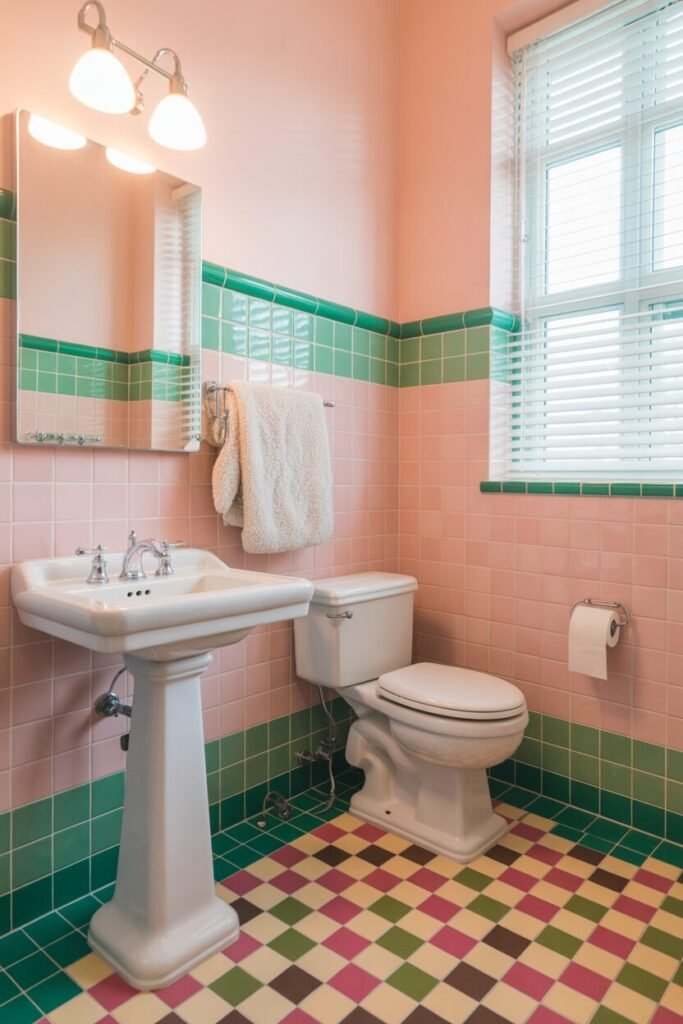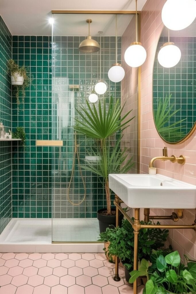 This pink-and-green tiled bathroom is basically your cool friend who thrifted her entire outfit and somehow looks editorial. The space works because it leans fully into contrast — the warm blush tiles paired with deep emerald instantly create visual drama while staying playful.
