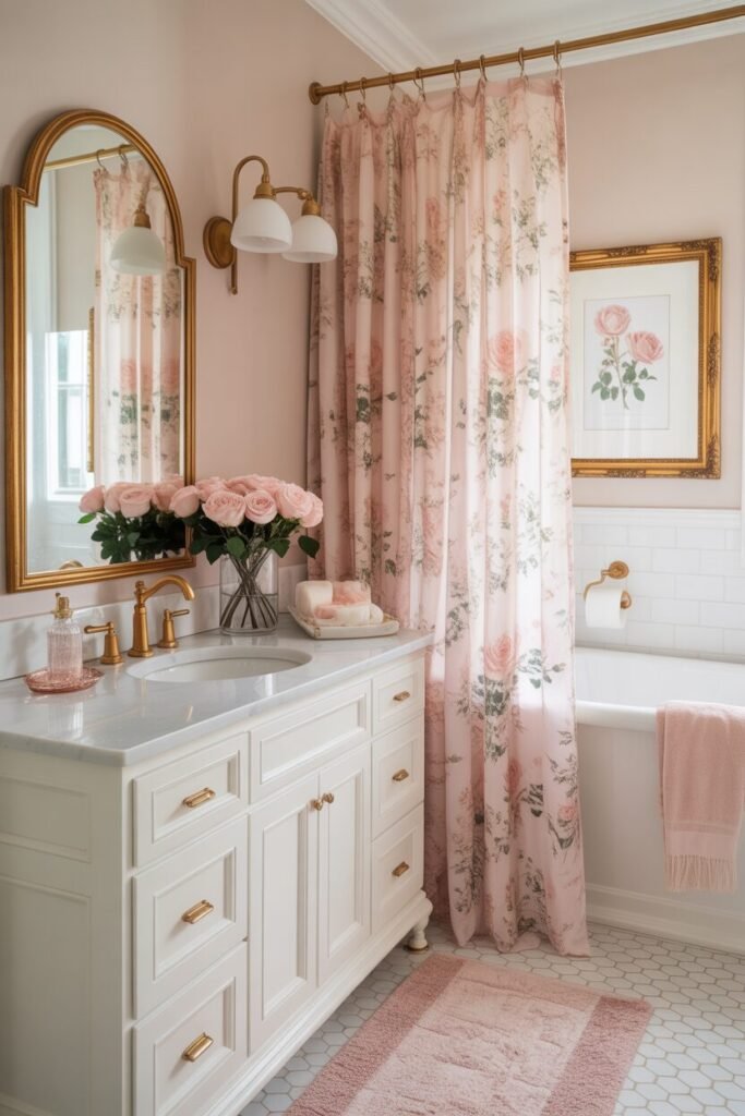 The design relies on pattern placement: keeping the florals vertical (curtain, art) while leaving the lower half calm creates balance. Meanwhile, the roses on the vanity add depth — repeating shape and color without overwhelming the eye. If you’re recreating this, follow the rule: one bold pattern, two soft solids, one metallic accent. Works every time.