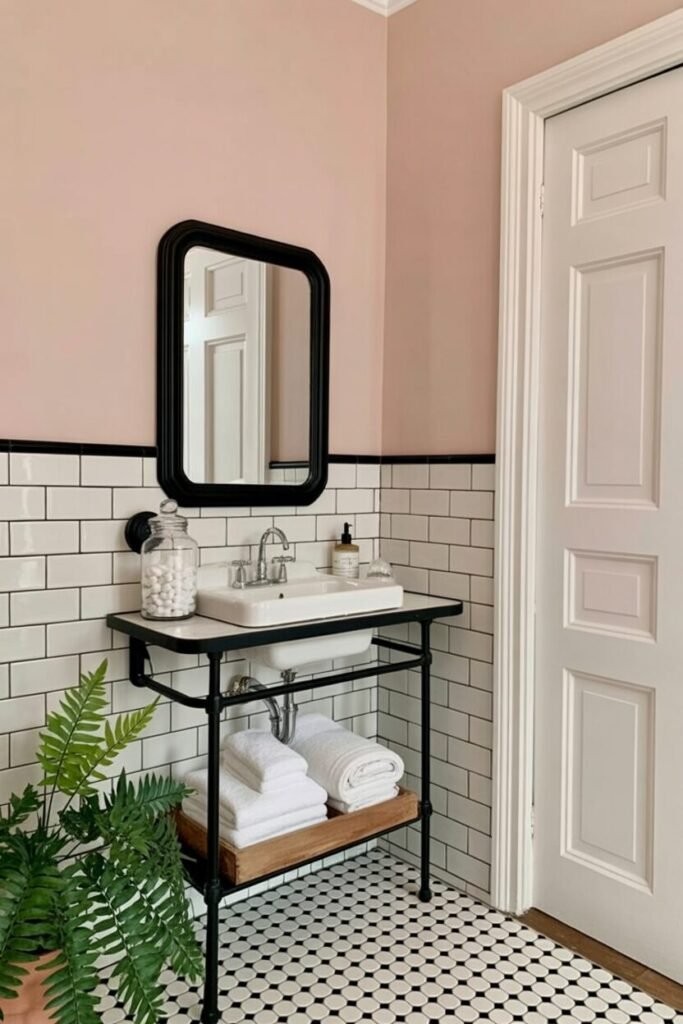This bathroom is proof that pink can be bold and grown-up when balanced with high-contrast monochrome elements. The soft blush walls instantly warm up the cooler black-and-white tiles, creating a palette that feels fresh instead of retro diner cosplay.