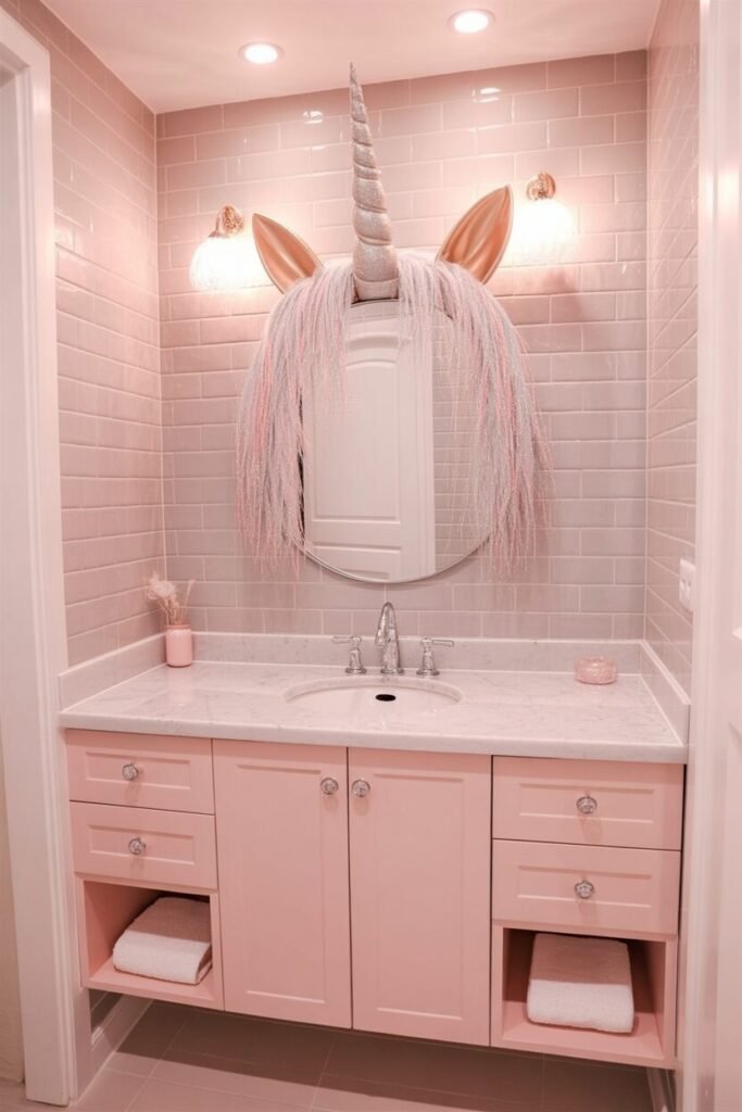If your inner child is still alive (and honestly thriving), this unicorn-themed vanity is your sign to let her run wild. The whole look works because it mixes playful fantasy with a surprisingly grounded design foundation. The pink subway tiles keep the backdrop consistent and clean, giving the unicorn mirror its spotlight moment without overwhelming the space.