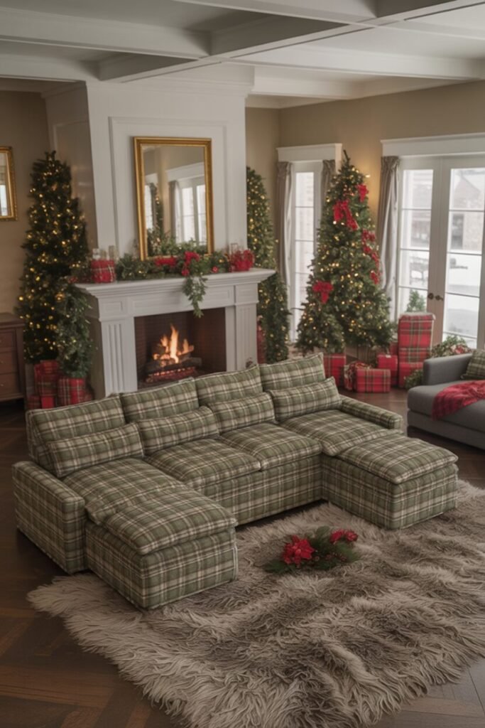 Here’s a living room that proves plaid can be luxurious, not loud. The key to pulling off this Ralph Lauren-style Christmas setup lies in proportion and color balance. That oversized tartan sectional might look bold, but it totally works because the rest of the space is calm — neutral walls, symmetrical trees, and consistent texture.