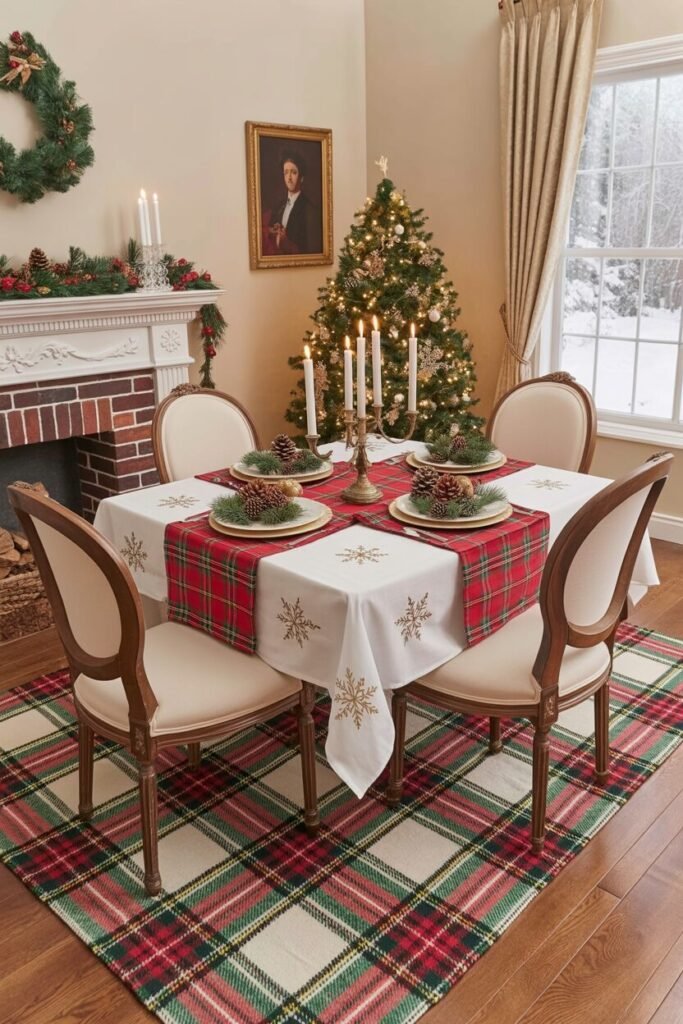 If there’s one thing we’ve learned from classic Christmas homes, it’s that plaid can instantly make any table feel like it’s wrapped in nostalgia. This dining setup nails it through thoughtful layering — the tartan runner adds pattern, while the white basecloth keeps things crisp and refined. The secret to recreating this look lies in contrast and repetition.