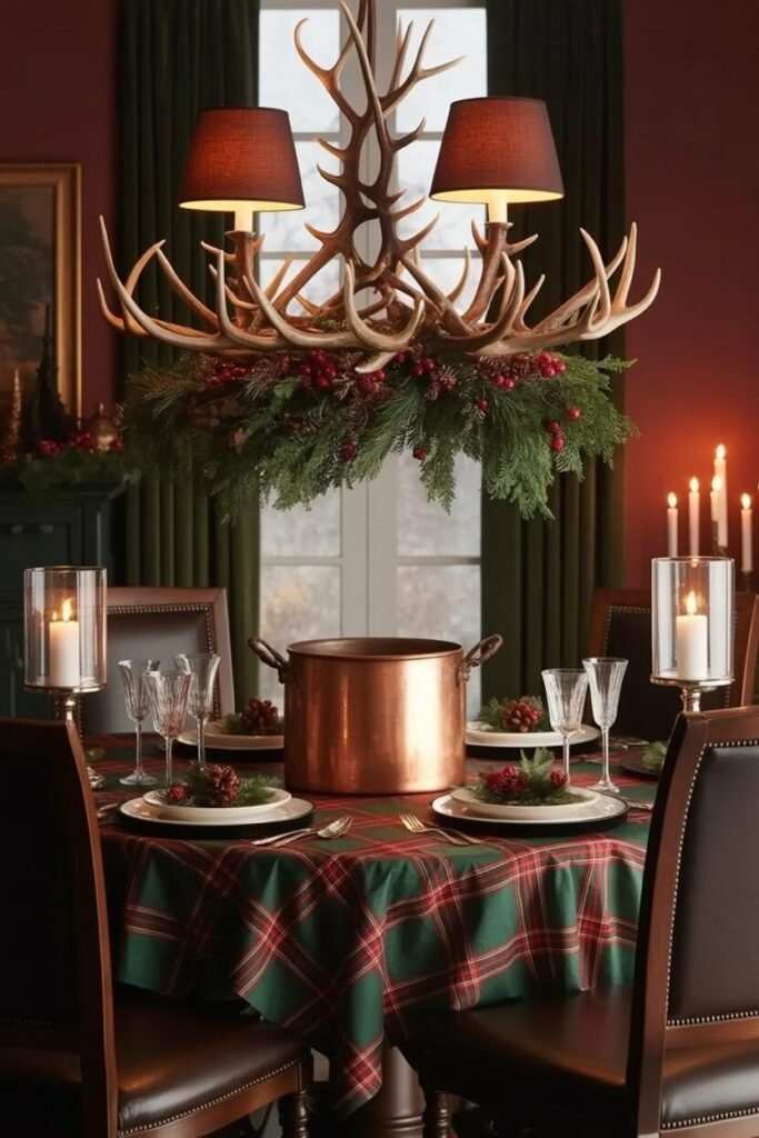 Add vintage crystal glasses and brass cutlery to strike that balance between cozy and couture. The centerpiece should feel natural yet intentional—evergreen branches, pinecones, and tall candles arranged under a glass cloche. This brings texture, height, and atmosphere without clutter. What really sells the look is symmetry: repeat the same candle height, balance garland placement, and let the plaid pattern guide your eye down the table.