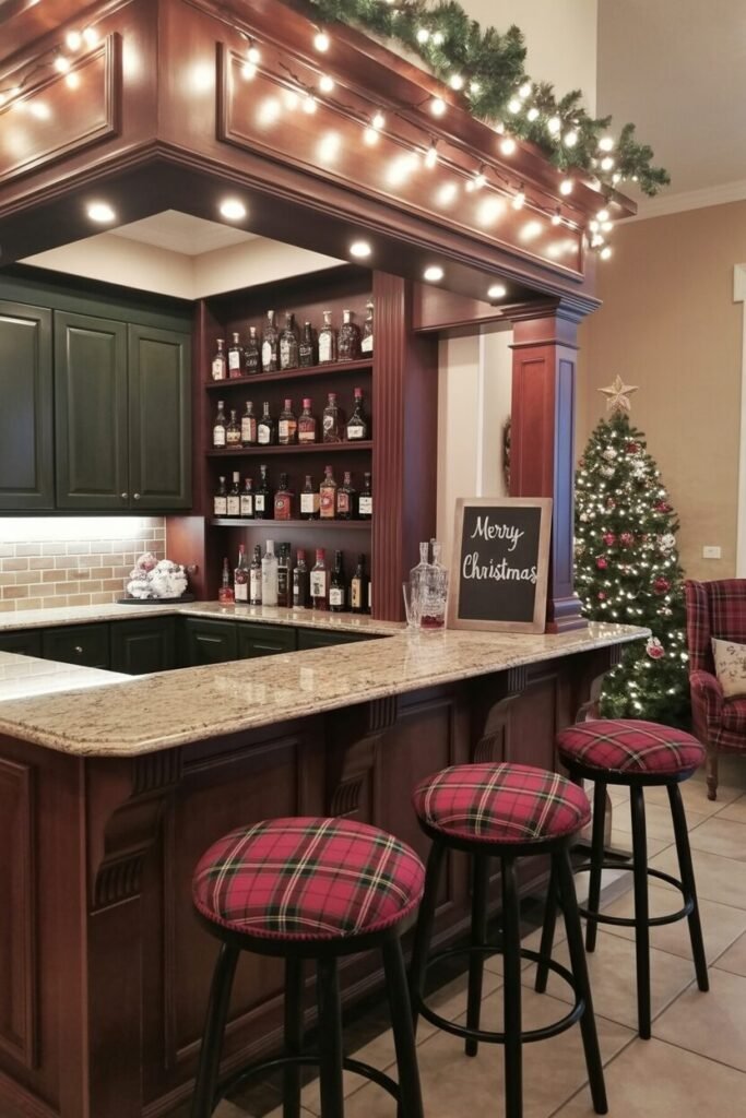 Now this is the definition of festive sophistication — a tartan bar nook that feels equal parts merry and mature. The design principle at play here is tonal harmony. Notice how the red plaid barstools complement the dark mahogany cabinetry instead of competing with it.