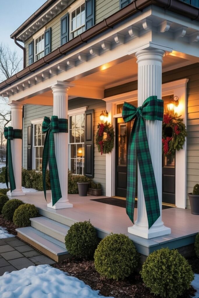 Your front porch sets the tone before guests even knock—and nothing says “festive sophistication” quite like a Ralph Lauren-inspired entryway. Start with symmetry: two lush evergreen wreaths tied with oversized tartan bows on double black doors. Then line the steps with glowing lanterns to create depth and warmth.