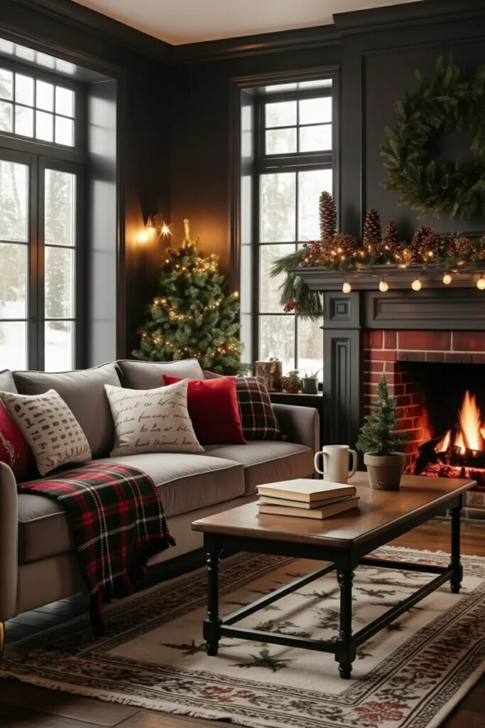 A tartan throw over a linen armchair, velvet pillows beside aged leather, and evergreen garlands trimmed with golden ribbon. Lighting is everything—dim, golden, and romantic. Let the tree shimmer in the corner with warm fairy lights and understated ornaments. A vintage tray with crystal glasses or a decanter adds that effortless “I just poured something elegant” touch.