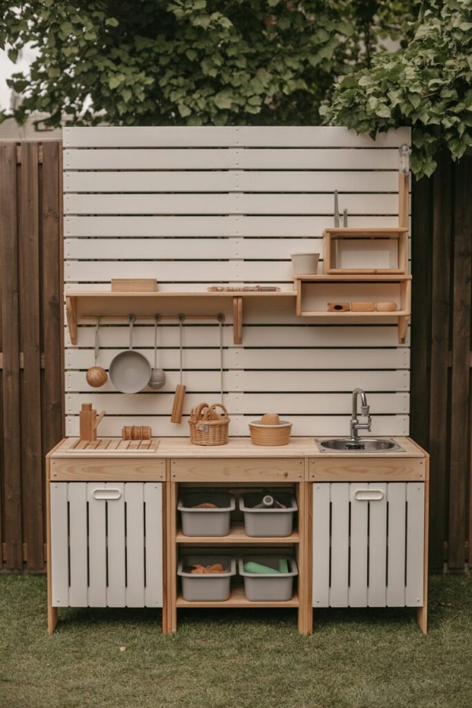 Behind the scenes, add a whitewashed vertical plank wall as an anchor and backdrop, a little wink at indoor shiplap without being a copy. And line the kitchen with edible herbs in terracotta pots, connecting sensory play with a cool “farm-to-table” feel. These choices don’t just act as a backdrop; they truly make the kitchen a built-in, natural part of your backyard retreat.