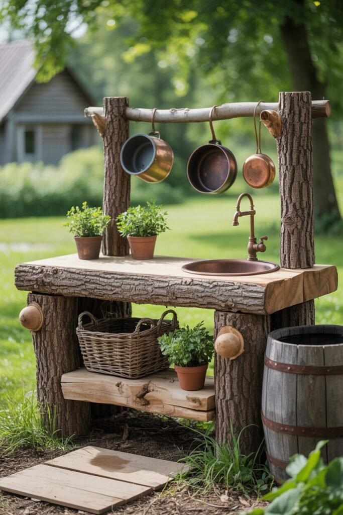 Pure rustic appeal? It’s a love letter to nature’s rhythms. So, we recommend this mud kitchen to be part of them! Use leveled-off logs for the countertop—they create a wonderfully rough but perfectly usable surface. A stick hanger for sticks you’ve collected (why hit Home Depot when you have the woods?) or from little twigs on a string? Genius for storing and for big storytelling sessions.