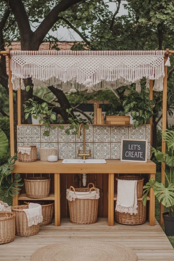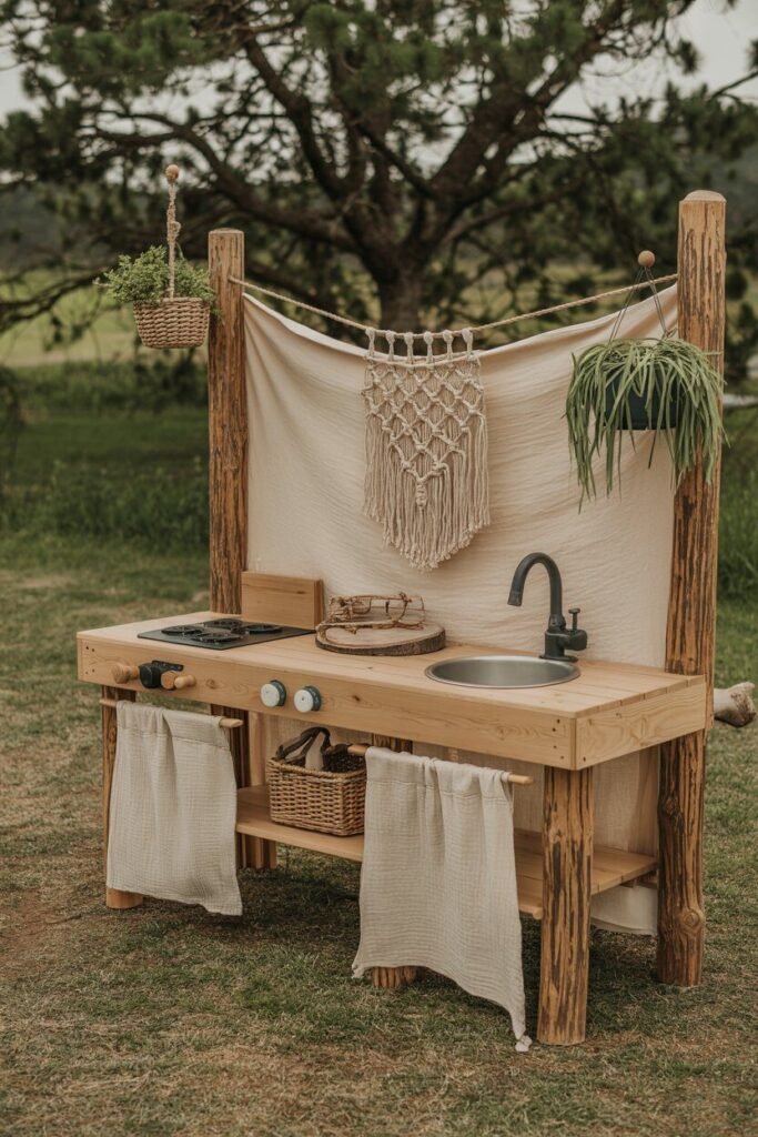 Bohemian chic, darling? Not some messy pile of tie-dye and dreamcatchers. Absolutely not. It’s a thoughtful mix of simple structure, rich textures, handcrafted details, and a real connection to the earth. And in a mud kitchen, Boho Chic is all about letting kids play freely without losing an ounce of meaning.