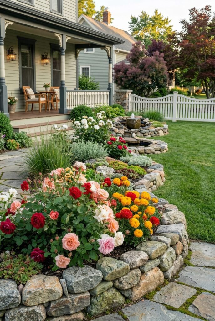 If we were recreating this, we’d focus on contrast. Pair soft florals with rough stone, structured porch lines with loose planting. And don’t skip the focal moment—that tiny rock fountain? It quietly steals the show without screaming for attention.