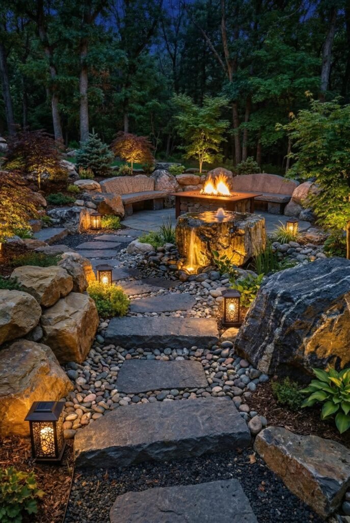Cozy Fire Pit Garden With Natural Stone Pathways