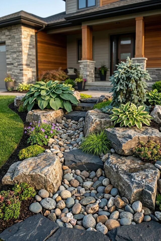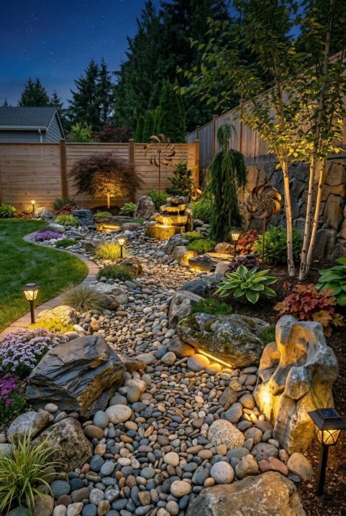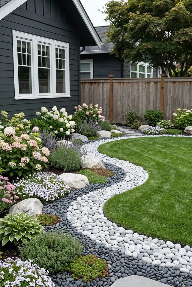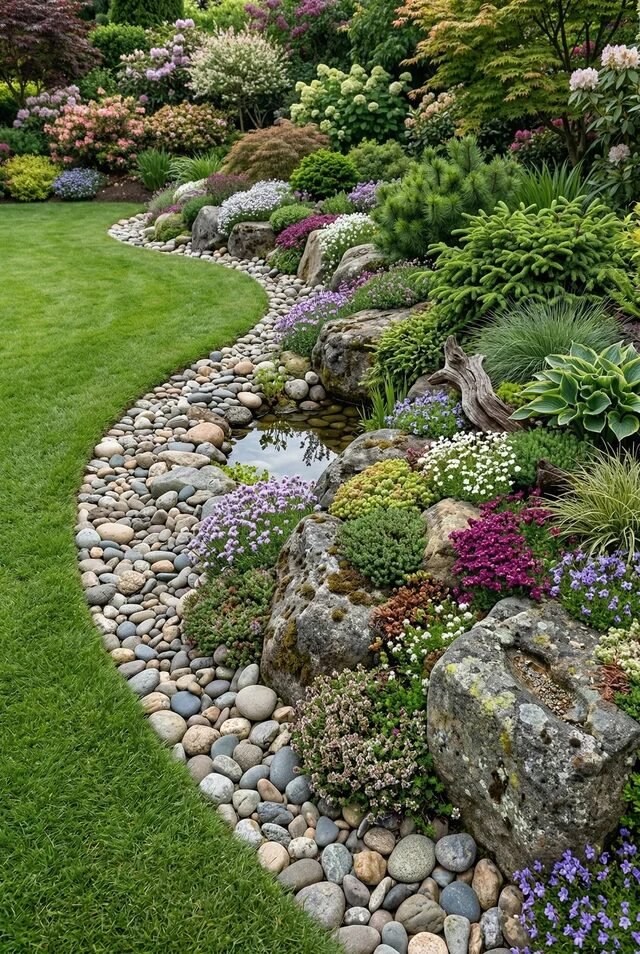 This setup is basically a dry riverbed glow-up, and we love that for us. The winding rock stream creates natural movement through the yard, guiding the eye from one zone to another. Curved pathways and “streams” make spaces feel larger because they reveal the garden gradually. It’s like visual storytelling but for landscaping.