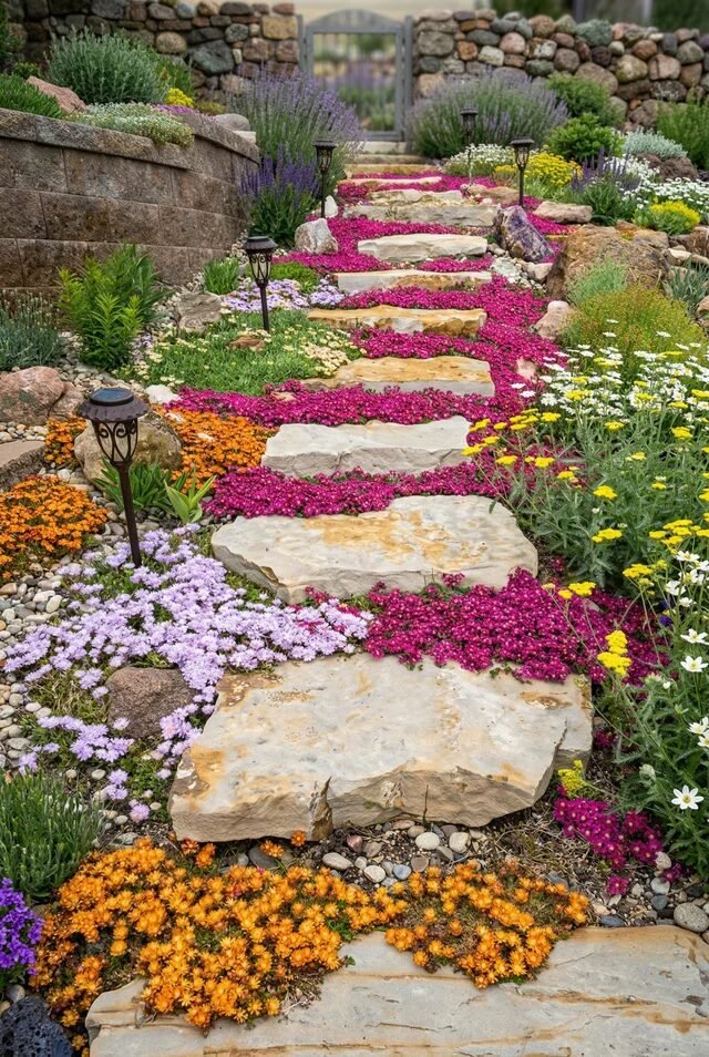 What makes this work is color control. Even though it looks wild, the palette is actually curated—pinks, purples, yellows, and soft greens repeating throughout. That repetition keeps things cohesive instead of chaotic. We want bold color, but with boundaries, otherwise it turns into visual noise real fast. The irregular stone placement also adds a natural, slightly whimsical flow.
