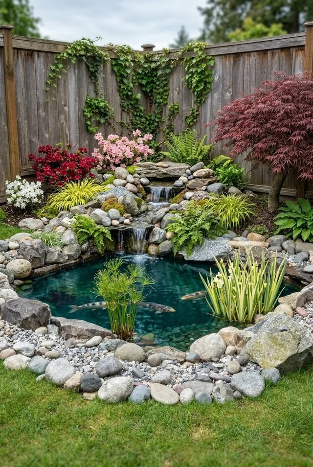 Planting here is also strategic. Taller plants sit behind the waterfall, while softer, lower greenery surrounds the pond edge. This frames the water feature without blocking it. If we’re recreating this, think in zones—background, midground, foreground. And don’t forget water clarity: dark liners + clean edges = that dreamy, glassy pond look.