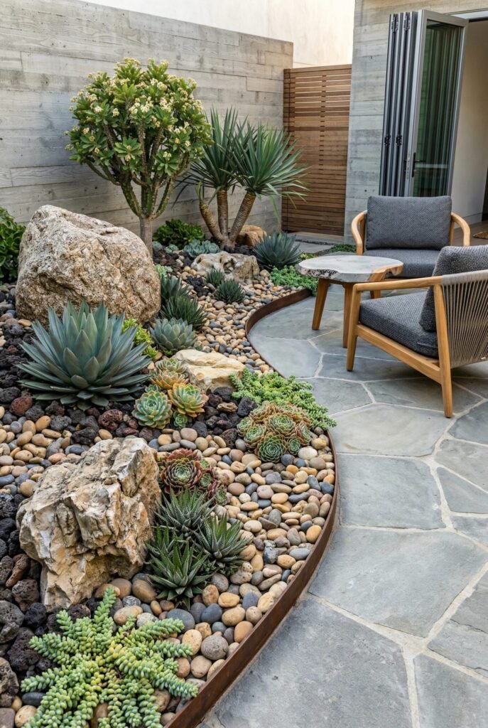 The curved border around the patio creates a natural transition between hardscape and planting area. Notice how the rocks vary in size—from chunky boulders to small pebbles. That variation keeps the space visually interesting. Scale contrast is what stops minimalist gardens from feeling flat or boring.
