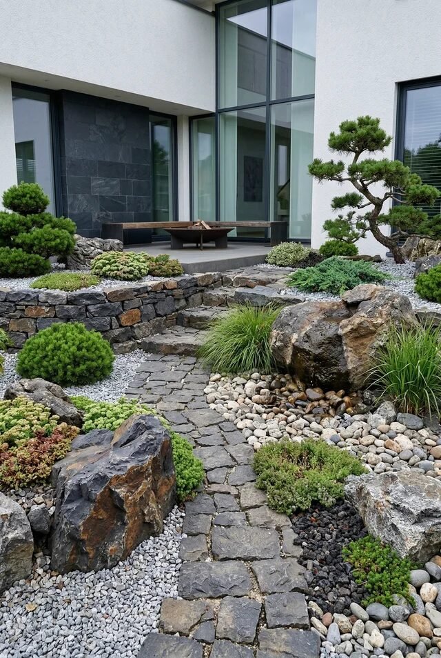 The material palette is super intentional. Dark stones, light gravel, and greenery create a balanced contrast that feels polished. And those larger rocks? They act as anchors, grounding the entire design. Every rock should feel like it belongs, not like it was randomly dropped in.