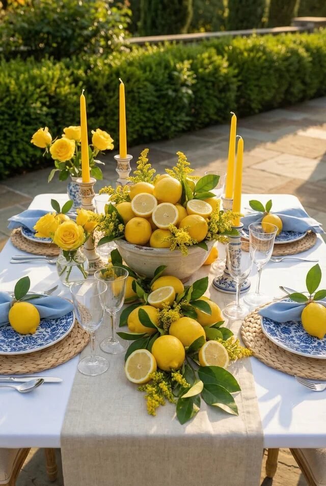 Tall yellow taper candles add height and drama without blocking conversation. This is a classic hosting trick: keep the tallest elements narrow so guests can still see each other across the table. Pair them with simple blue or neutral plates so the lemons remain the star of the show. The result feels bright, relaxed, and suspiciously like a Pinterest win.
