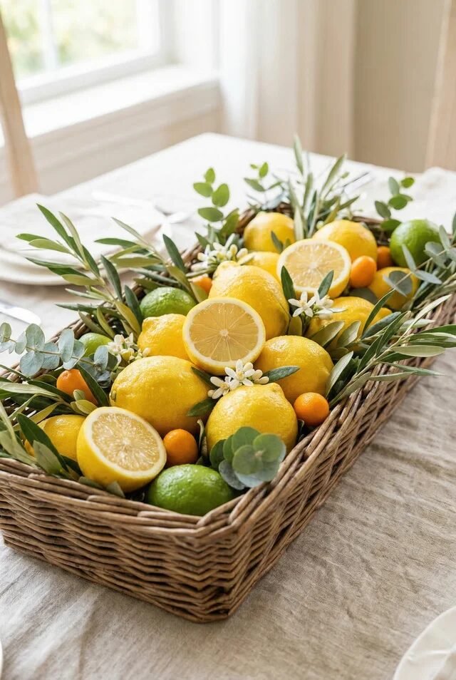 This centerpiece is proof that casual can still look intentional. The wicker basket introduces texture contrast, which is one of the easiest ways to elevate simple ingredients like lemons and greenery. Smooth citrus paired with woven fibers creates that cozy layered look designers are always chasing.