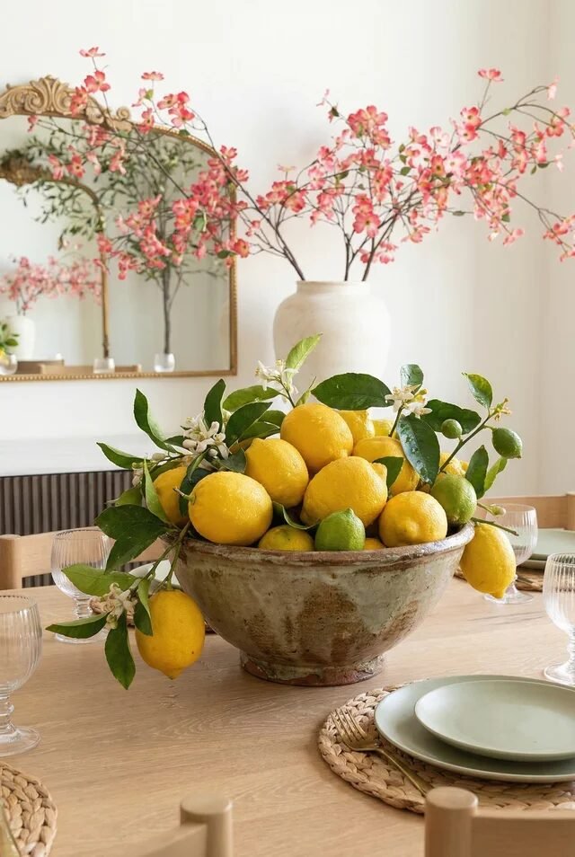 Sometimes the most effective centerpiece strategy is simply… abundance. This bowl works because it leans into the principle of visual fullness, which makes a table feel welcoming and lived-in instead of overly styled. The large rustic bowl acts as a grounding element while the lemons cascade naturally outward, creating a relaxed, organic silhouette.