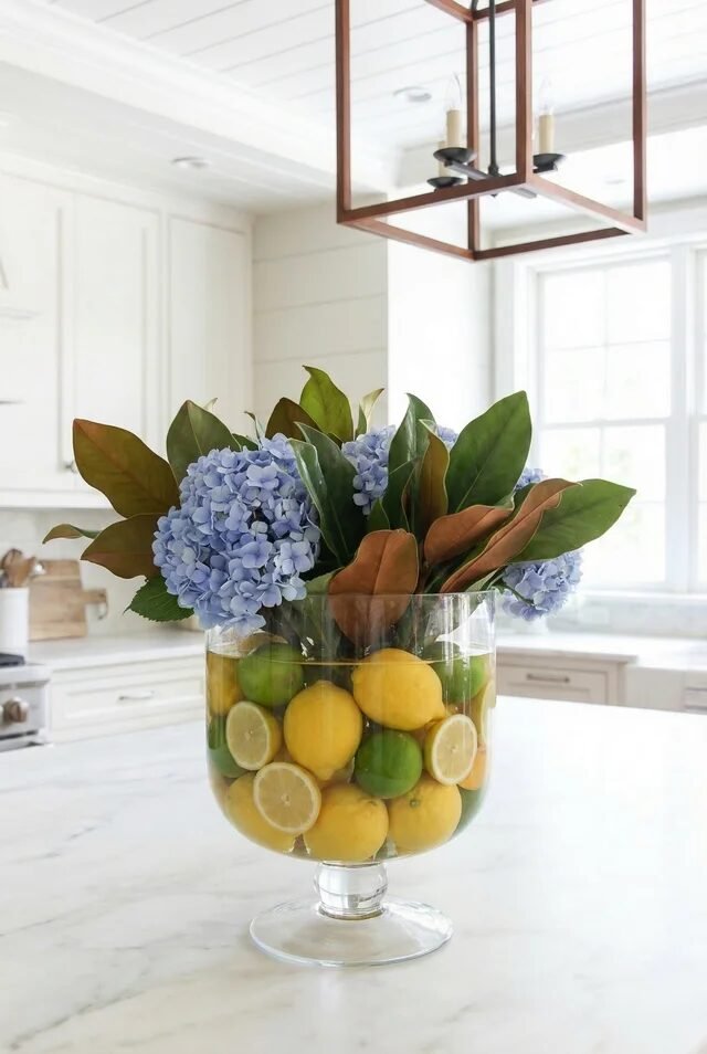 This centerpiece is basically the interior-design version of a glow-up. The magic comes from stacking layers inside a transparent vessel, which instantly creates depth and visual intrigue. Instead of hiding the base of the arrangement, the lemons and limes become part of the decorative story.
