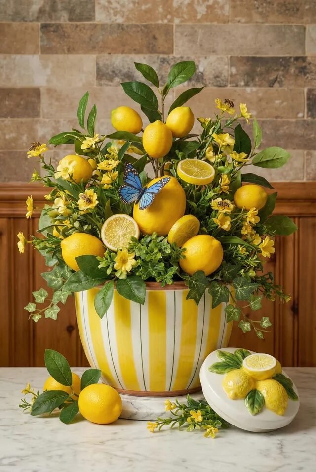 Tuck lemon halves and whole lemons throughout the arrangement so they appear nestled among the stems. That placement makes the citrus feel intentional instead of decorative props. Adding small whimsical details—like a butterfly accent—enhances the storytelling. Decor that tells a little visual story tends to feel memorable and playful rather than purely decorative.