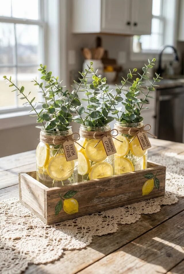 To recreate the look, fill each jar with water and lemon slices pressed against the glass. This simple trick creates beautiful circular patterns that catch the light. Add eucalyptus stems or soft greenery for height. Vertical elements help smaller arrangements feel more substantial.