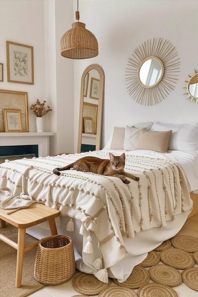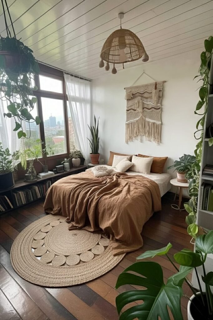 If you want to recreate this: start with one dominant texture (linen, rattan, wool) → layer supporting textures around it → add plants in different heights to create rhythm. And yes, leave your bed unmade—apparently that’s boho now, not lazy.