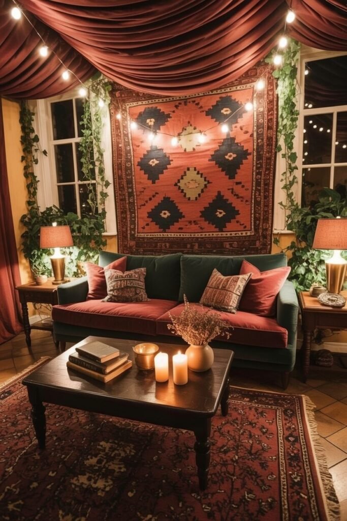 To recreate this drama: pick one bold textile and let it control the color palette. From there, add supporting patterns with smaller pillows or rugs. Keep everything in warm tones for cohesion. And yes—more candles than necessary is fully encouraged.