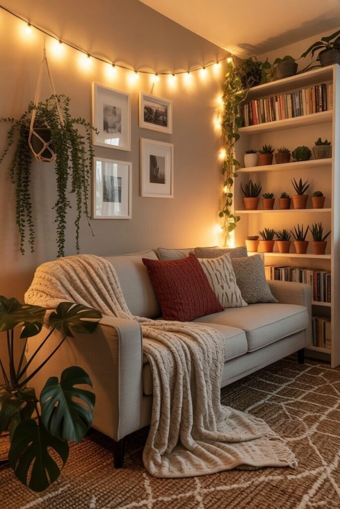 This cozy little corner is basically the interior-design version of a warm hug, and the secret weapon here is the layered lighting. The string lights don’t just sit there looking cute—they create a soft, diffused glow that curves across the wall, guiding your eyes through the space and eliminating harsh shadows. The bookshelf plants trail down just enough to soften the right angle of the shelves, adding movement and keeping the nook from feeling boxy.