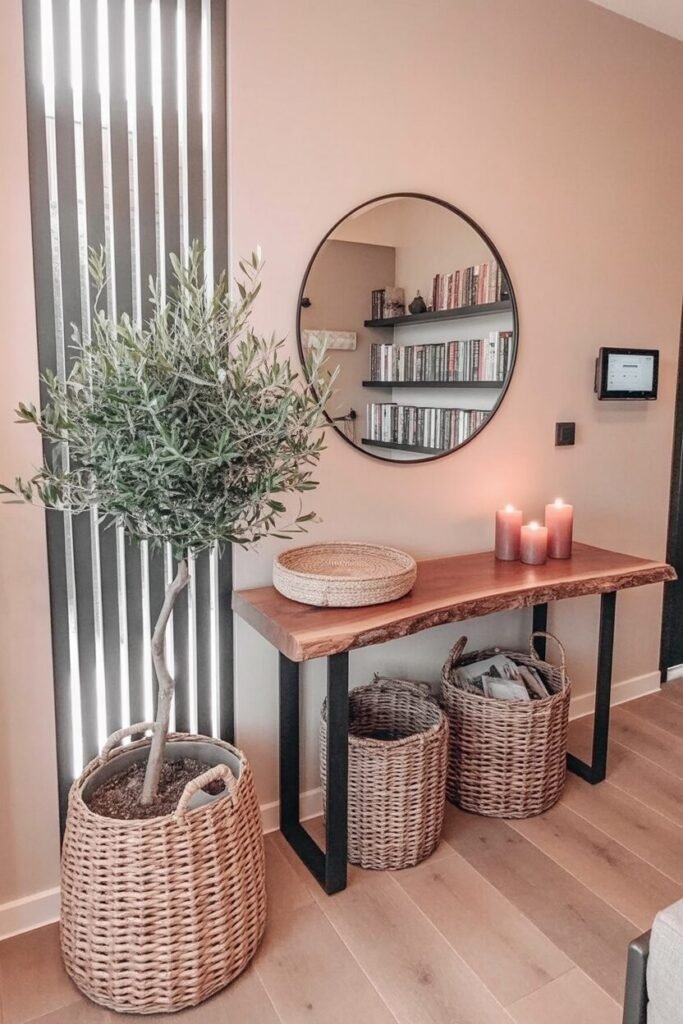The oversized round mirror isn’t just decorative; it acts as a light amplifier, bouncing whatever illumination exists around the room and instantly making the entry feel more open. The wicker baskets below help visually ground the table so the tall olive plant doesn’t dominate the composition. Everything feels intentional but still relaxed, which is peak boho-apartment energy.