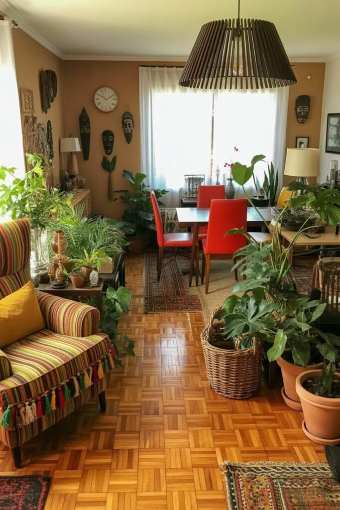 The heavy use of plants introduces organic shapes that interrupt all the straight lines of the furniture, making the space feel alive rather than busy. The masks and wall decor supply a strong vertical emphasis, giving the room cultural richness and visual storytelling.