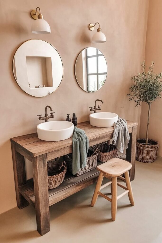 This bathroom is giving spa energy, but like… a spa owned by someone who drinks oat milk and meditates before sunrise. The key here is the use of honest materials—raw wood, matte walls, woven baskets—which creates a sensory calm without limiting the space to plain minimalism. The two round mirrors soften the strong linearity of the vanity, creating a balanced contrast that feels warm instead of sterile.