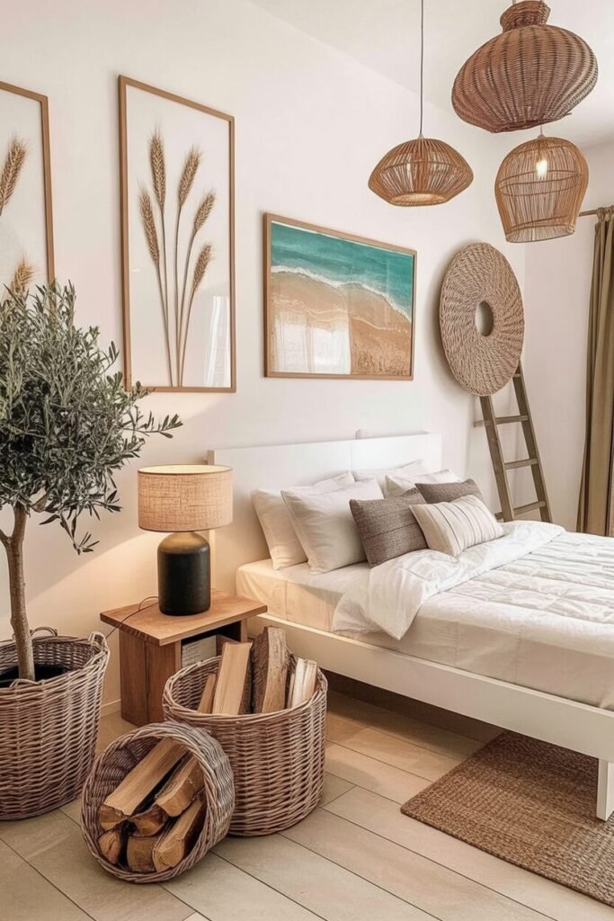 The baskets full of wood—and the olive tree—add rustic grounding that prevents the room from floating into overly “beach resort” territory. The large art pieces create vertical anchors, framing the bed so it feels intentional and symmetrical.