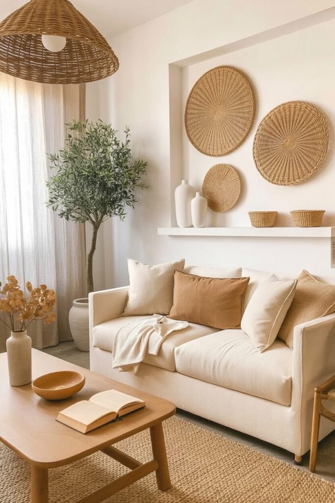 This living room is a masterclass in visual serenity, the kind that whispers “drink water and mind your business.” The palette stays within warm neutrals, allowing the textures—woven baskets, linen upholstery, raw wood—to add depth without noise. The circular wall baskets create a gentle focal point, pulling the eye upward and giving the room a sense of height. Repetition of round shapes keeps the space cohesive and soft.