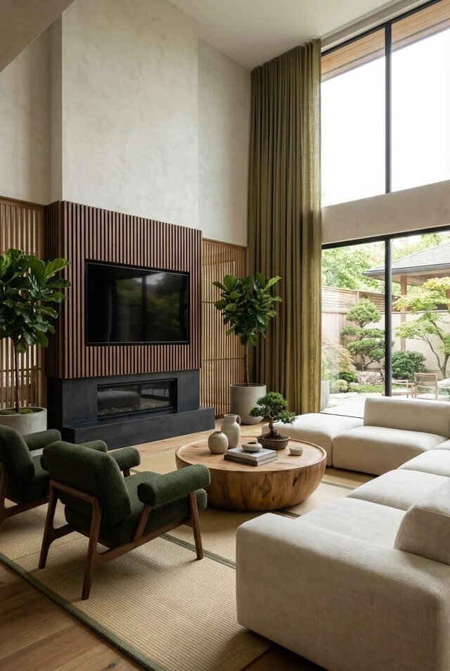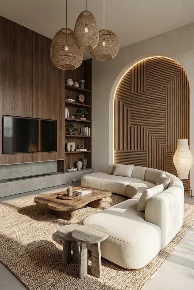 This is where Japandi gets a little bold—but still whispers, not screams. That curved sofa paired with the geometric wood wall? Chef’s kiss. The contrast between soft curves and structured lines creates visual tension—in a good way.