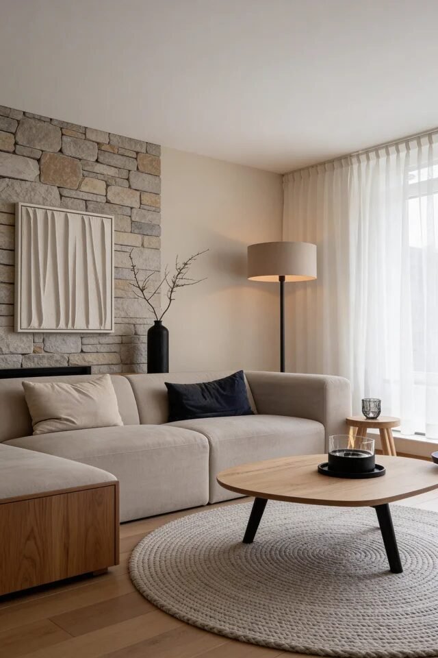 This space is giving “effortless calm” but let’s be honest—there’s strategy behind it. The stone wall instantly adds texture and weight, so everything else intentionally softens it. That’s the core principle: balance heavy materials with light, quiet elements. The neutral sofa, sheer curtains, and simple decor prevent the room from feeling visually loud.