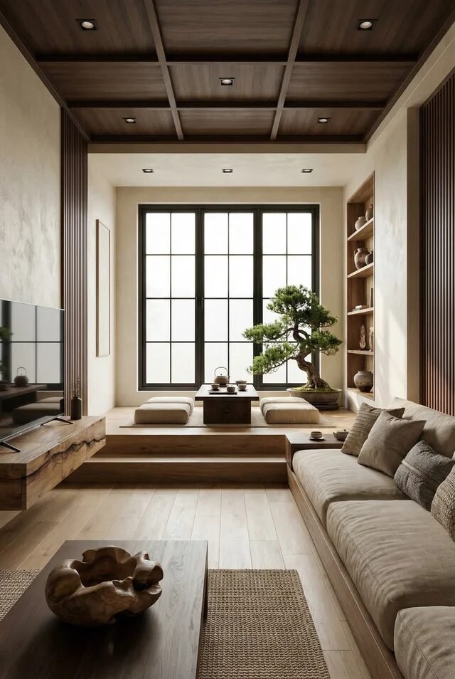 The low seating reinforces that grounded Japandi feel, while the symmetrical layout brings order. Symmetry here isn’t strict, but it’s enough to make the room feel stable and calm. Even the bonsai placement acts like a quiet focal point.
